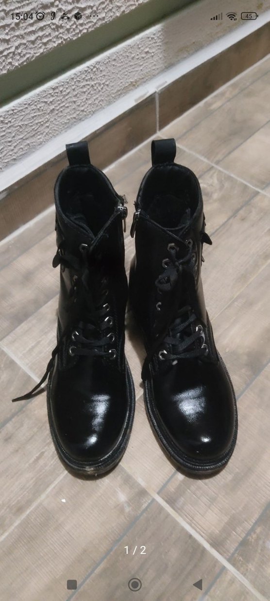 Siyah deri gotik botlar, stiletto Topuksuz ve tokalı detaylara sahiptir. Bağcıklı ön kısmı günlük kullanıma uygundur. parlak değil sildigim için parladı fotoğrafta