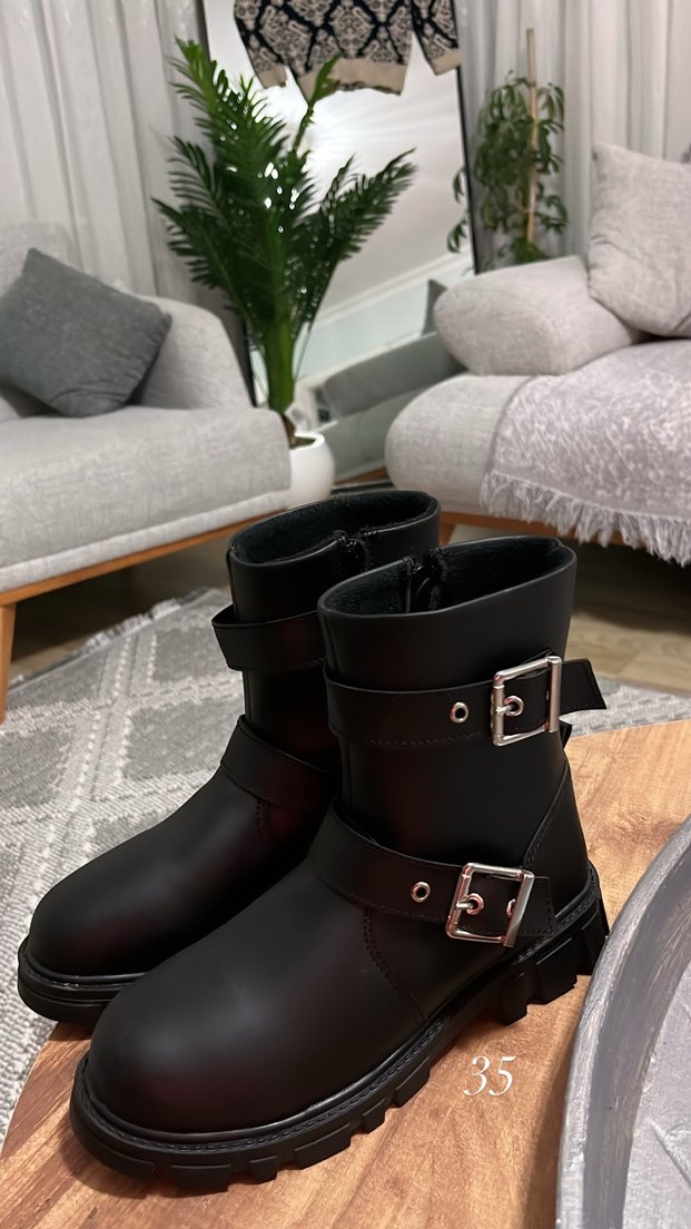 Siyah deriden yapılmış, tokalı kayışlara ve kalın topuklara sahip gotik tarzda kadın botları. Trendy günlük kullanım için uygundur.