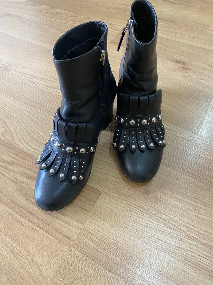 Siyah deri, tokalı ve desenli çivili detaylara sahip gotik topuklu botlar, günlük kullanıma uygun rock punk havası katıyor. Ninen west 38 deforme yoktur rahat kullanımlı deri