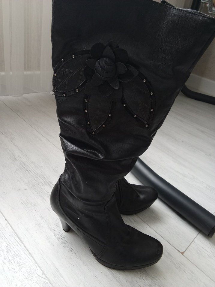 Siyah deri dizüstü çizme, yüksek topuklu ve tokalı çiçek desenli detaylara sahiptir. Gotik tarz için uygundur.