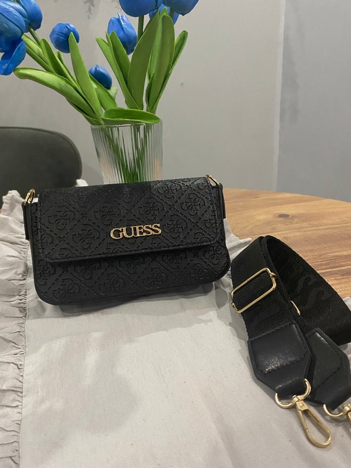Siyah deri Guess kadın çanta, baskılı desen ve kemerli askıya sahip, sokak modası ve klasik Paris tarzını günlük kullanıma sunar.