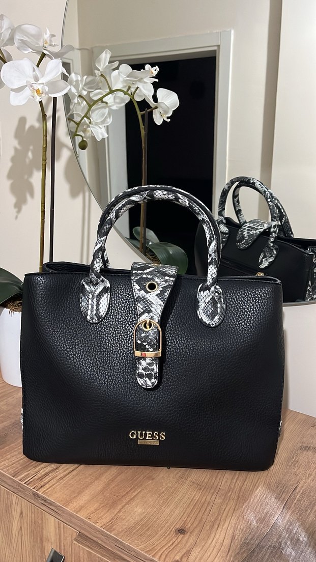 Siyah deri çanta, yılan desenli tokalı askı ve kulplarla klasik ve sokak stilini birleştiriyor. Önünde Guess siyah logosu bulunur. Çanta muadil hiç kullanılmamıştır gerçeği ile birebirdir