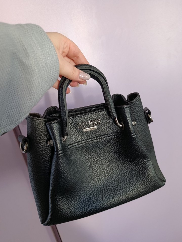 Siyah deri Guess el çantası, tokalı detay ve parlak yüzeye sahiptir. Minimalist ve sokak stiline uygun, günlük kullanıma ideal.