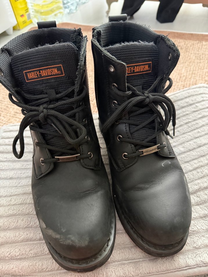 Harley-Davidson markalı siyah deri biker botlar, tokalı ve bağcıklı, günlük kullanım için uygun, grunge punk tarzında.