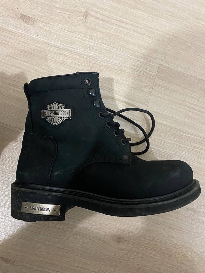 Harley-Davidson siyah deri biker bot, stiletto topuk ve tokalı detaylarla, günlük kullanıma uygun rock punk havasında.