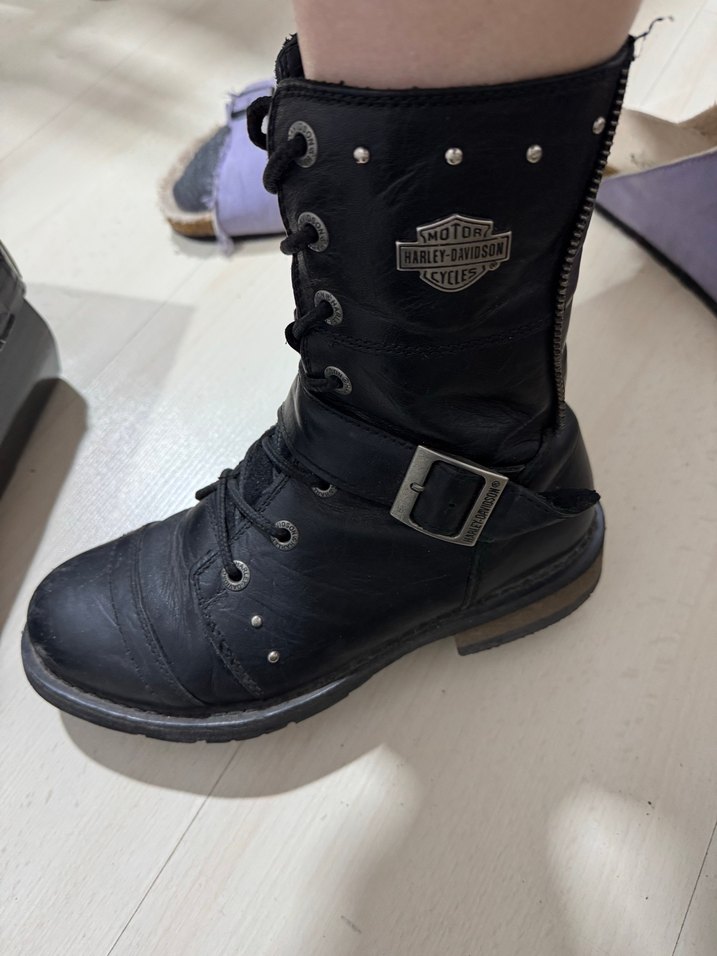 Yüksek topuklu, tokalı ve bağcıklı siyah deri Harley-Davidson biker bot. Desensiz, trend casual stil için uygun.