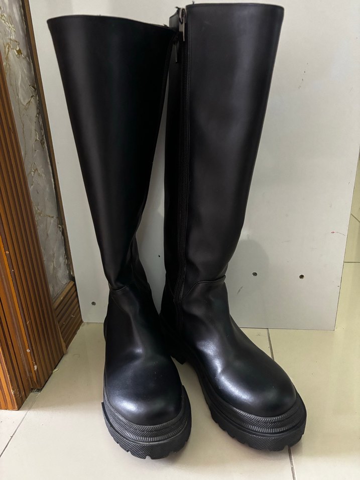 Siyah, suni deri malzemeden diz altı kadın çizme. Kalın topuklu günlük kullanıma uygun, zahmetsiz şıklık sunar.