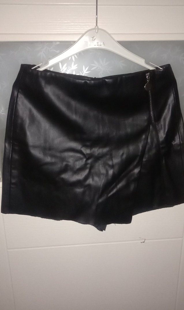 Kemerli, kısa kesim ve dar kesim siyah deri mini etek, gotik tarzda cesur bir görünüm için uygundur.