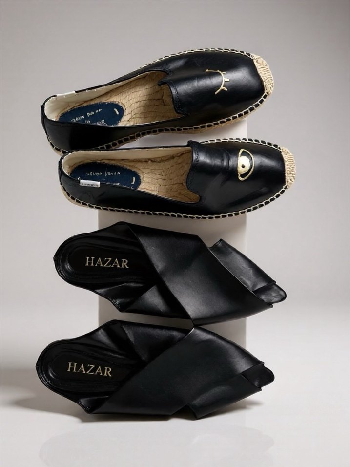 Siyah deri espadriller, dolgu topuklu, işlemeli detaylar ve tokalı tasarıma sahiptir. Günlük kullanım için uygundur, HAZAR markalı.