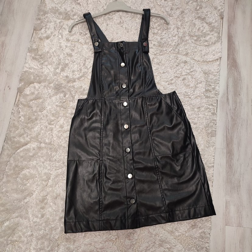 Siyah deri, askılı ve düğmeli ön detaylı, fitted kesim midi elbise. Goth ve grunge punk tarzlarını yansıtır.