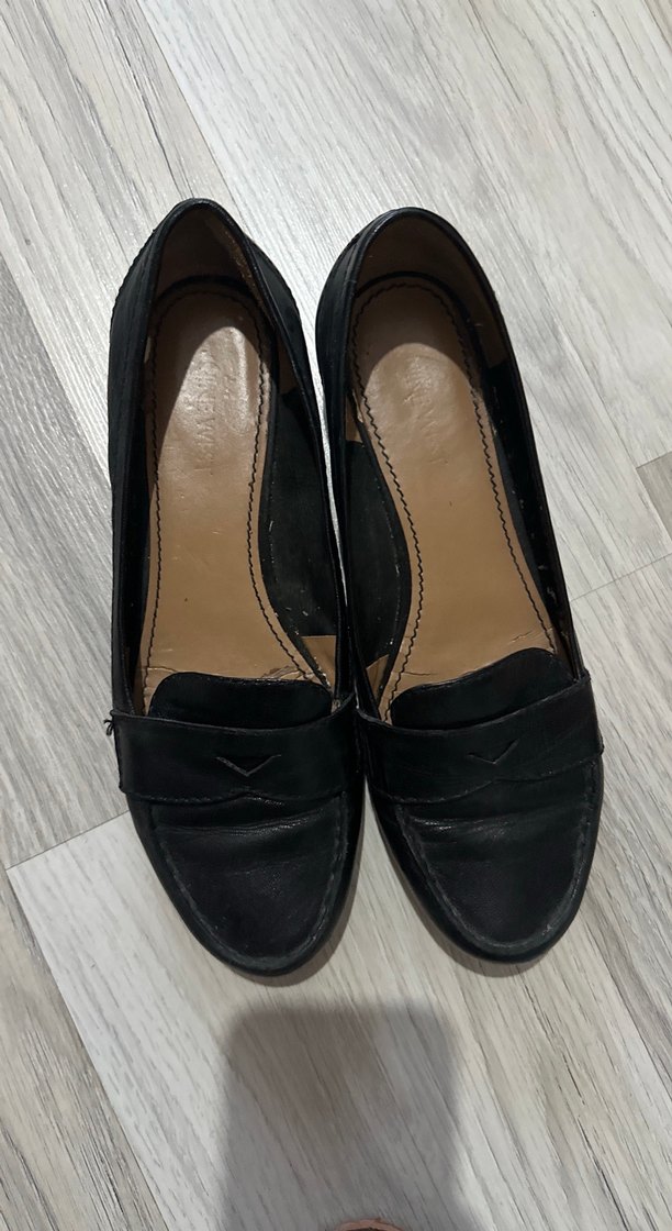 Siyah deri, kadın babet. Günlük kullanım için klasik ve sade tasarım.