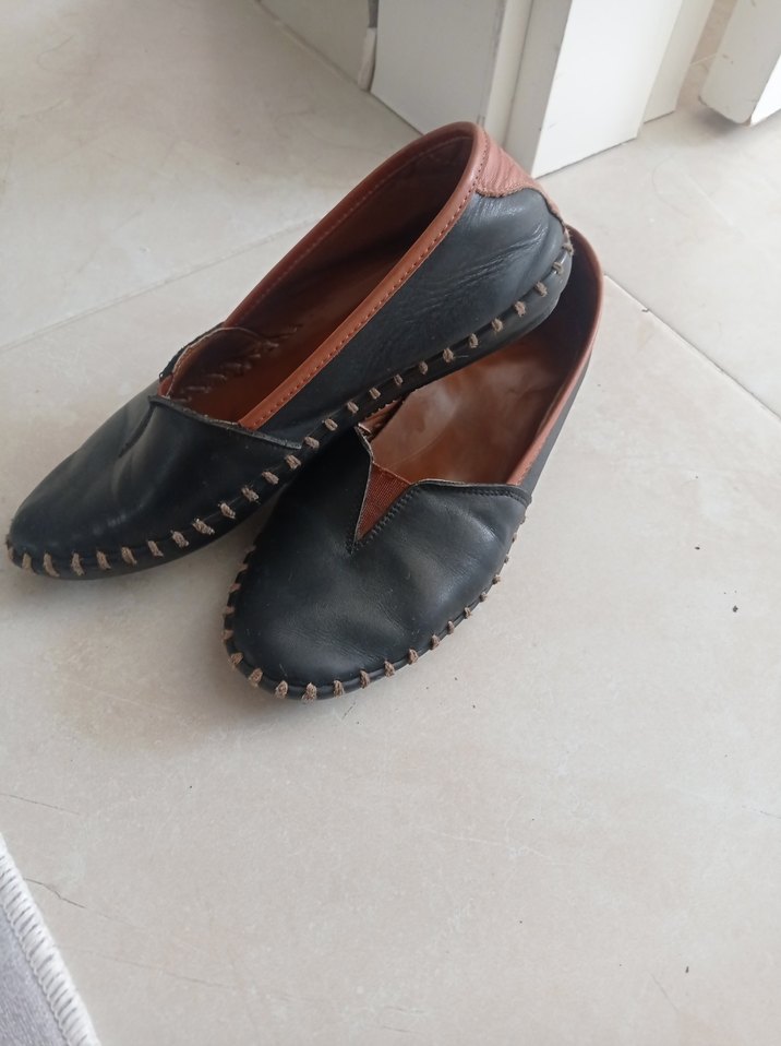 Siyah deri kadın babet ayakkabılar, dikilmiş detaylar ve hafif tokalı sade tasarımı ile günlük kullanıma uygundur. Kusuru hasarı yoktur
