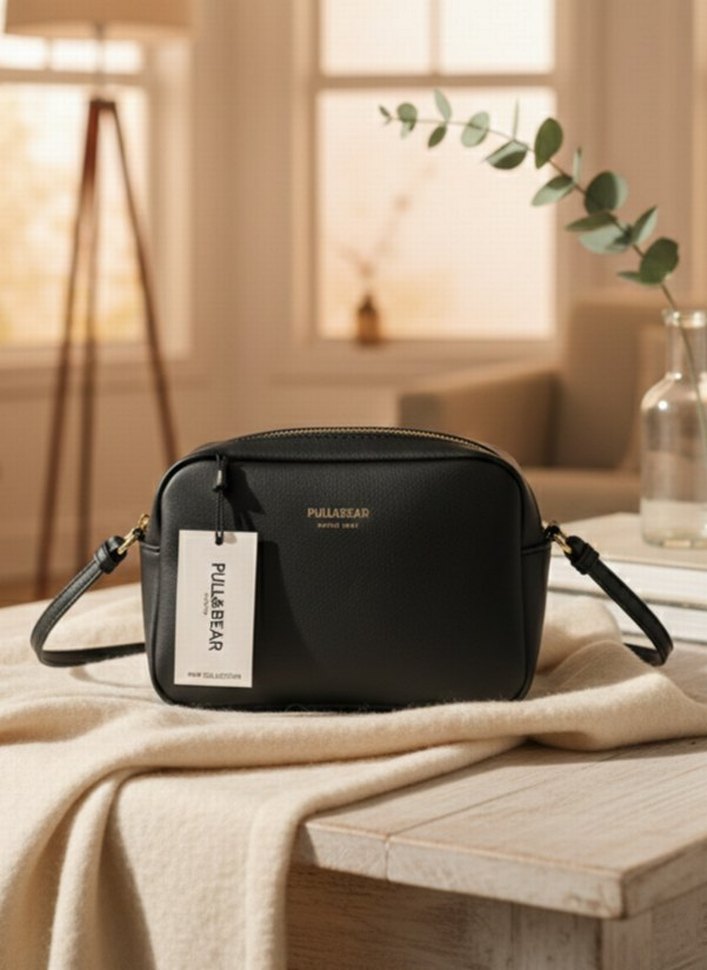 Baskılı detaylı, kemerli siyah deri kadın bel çantası. PULL&BEAR logosu bulunur, trend sokak stiline uygundur.