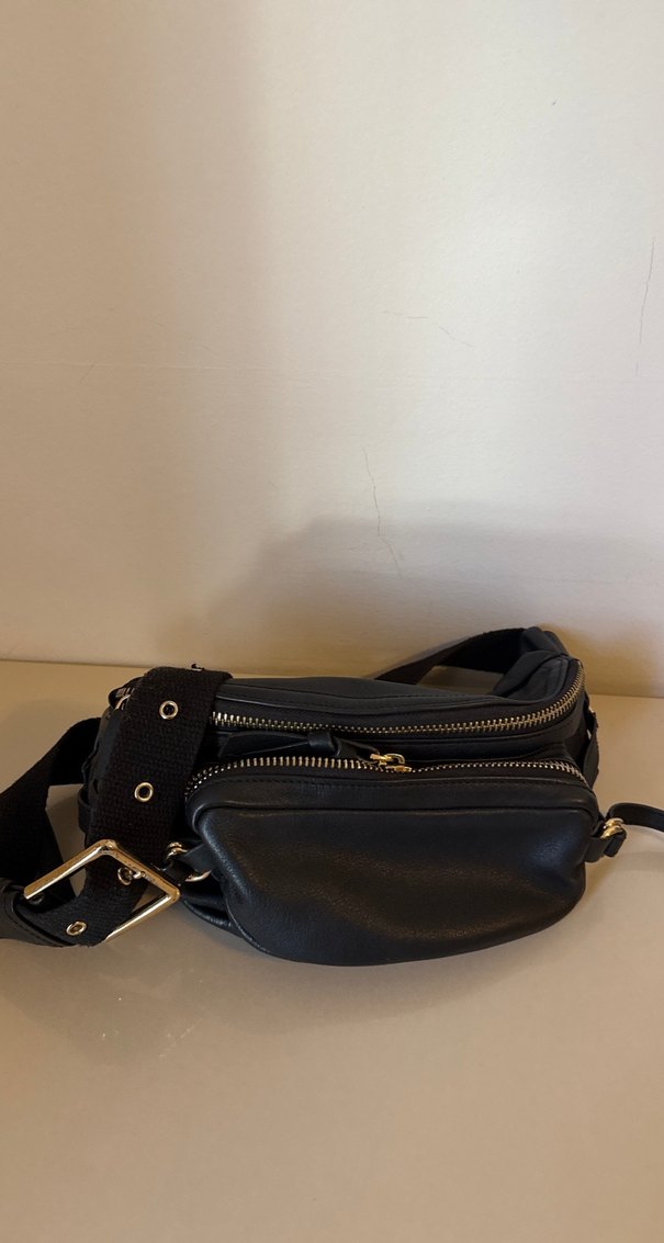 Siyah deri, kemerli kadın bel çantası. Minimalist ve sade tasarıma sahip, günlük kullanım için uygundur. Çoklu fermuarlı bölmeleri vardır.