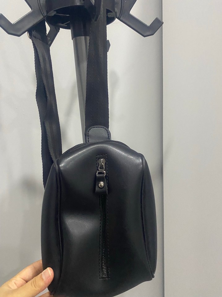 Siyah deri, tokalı, biker tarzı kadın çapraz çanta, minimalist tasarımlı, günlük kullanıma uygun.