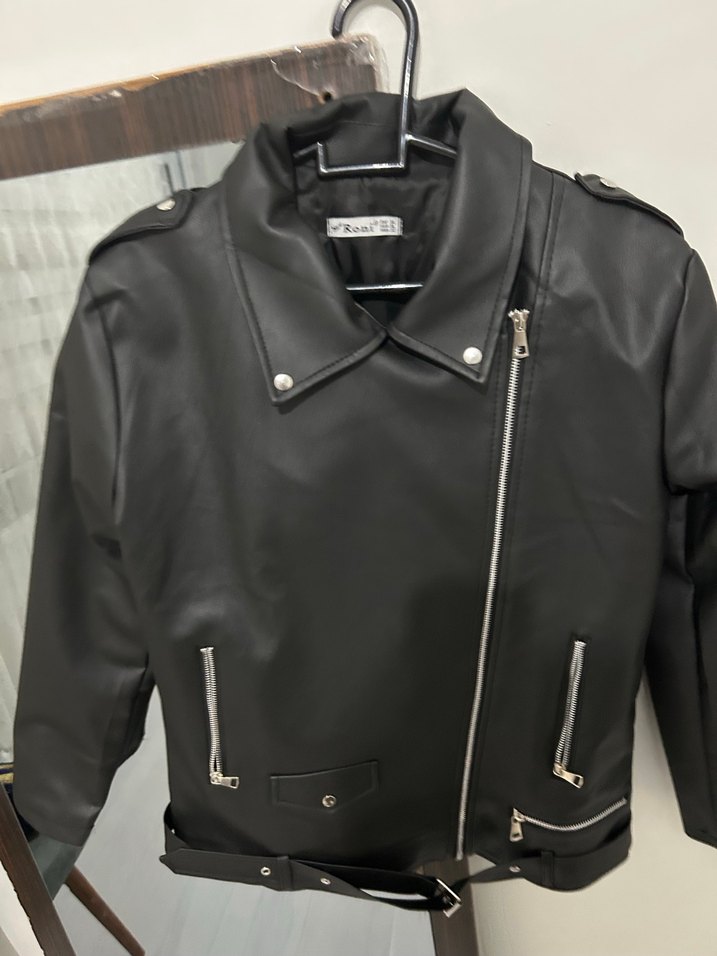 Bu siyah deri biker ceket, fitted kesim ve yakasında çıtçıtlı detaylar içerir. Strappy kollu ve fermuarlı ceplidir, günlük sokak stili için uygundur.