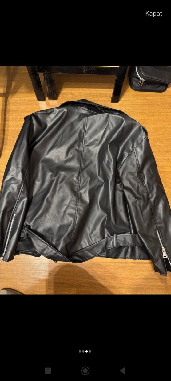 Siyah deri biker ceket, dar kesim, uzun kollu, kesik yaka ve fermuarlı detaylara sahiptir. Günlük sokak stili için uygundur.