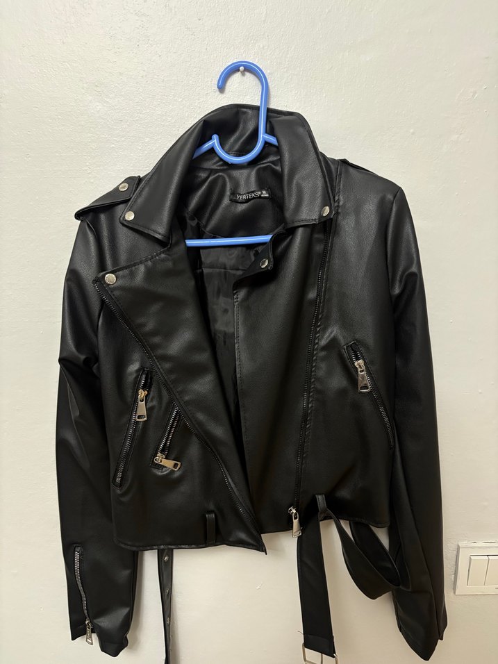 Siyah deri, kemerli ve fermuarlı cepli, kesimi vücuda oturan biker stil kadın ceketi. Günlük rahat kullanıma uygun.