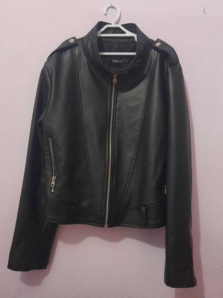 Siyah, fitted deri biker ceket, fermuarlı ön ve cepleri, kesik yaka ve askılı kollara sahip. Günlük kullanım için uygun.