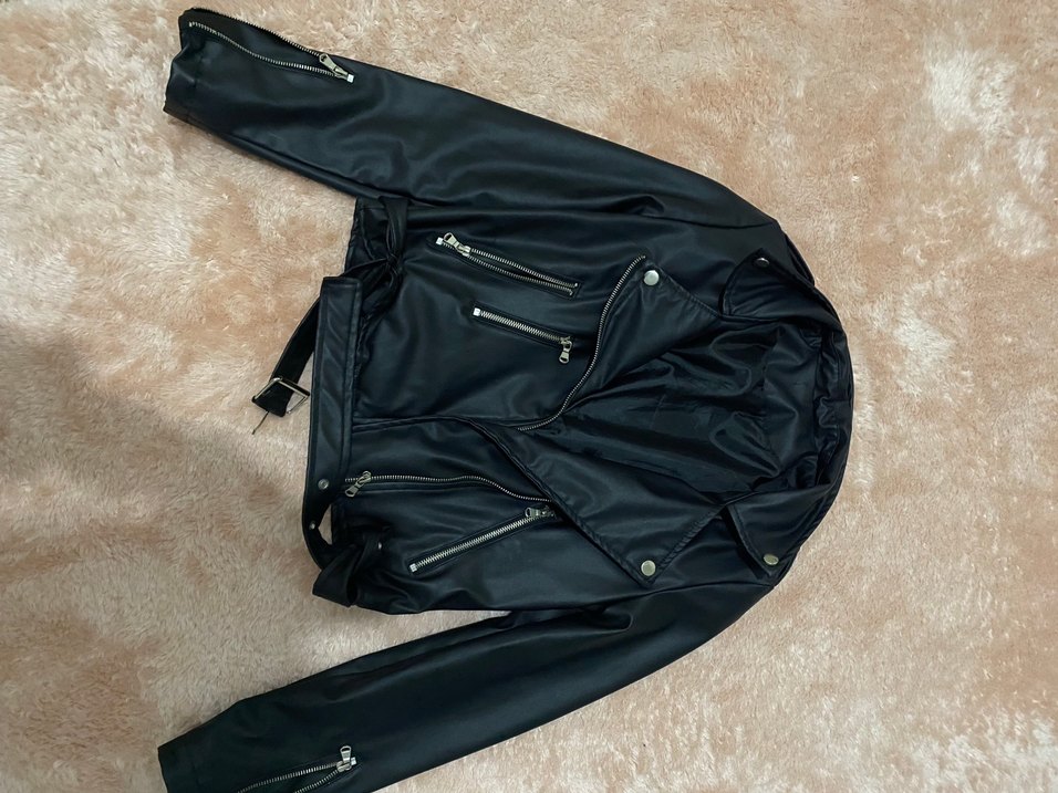 Siyah deri, dar kesim biker ceket. Notlu yaka, çoklu fermuarlı cepler ve askılı uzun kollara sahip, belden kemer detaylı. 2 kere giymişimdir yep yeni duruyor addaxtan almıştım