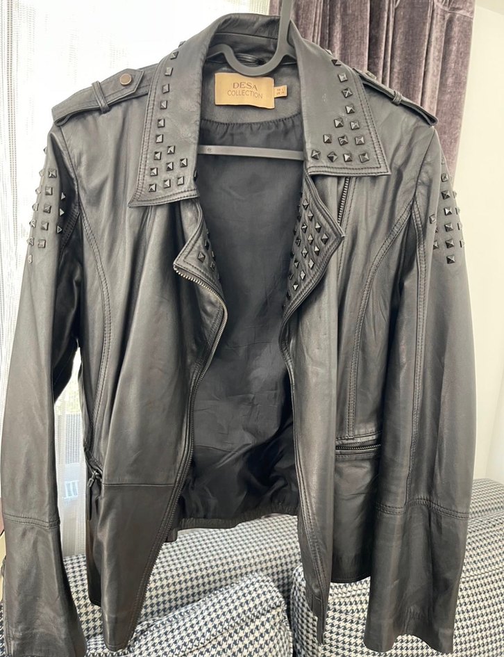 Siyah zımba detaylı, fıt kesim siyah deri biker ceket, çentikli yaka, uzun kollu ve tokalı detaylara sahiptir. Tertemiz ve sorunsuzdur. M/L uyumludur.