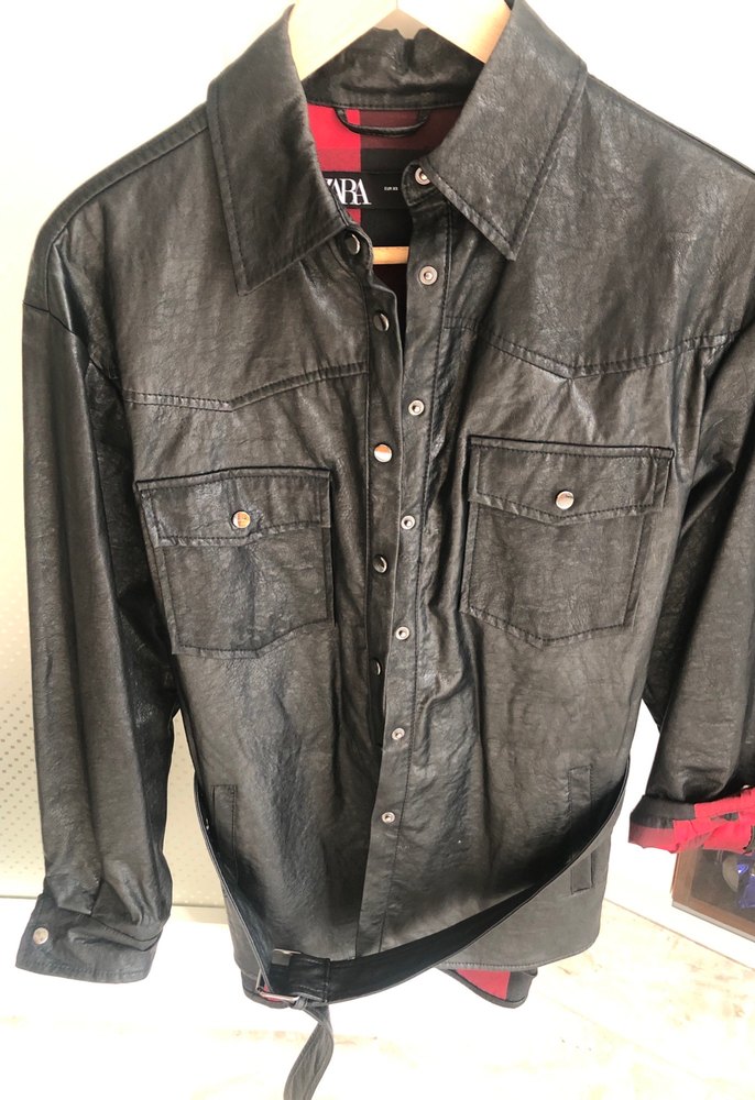 Siyah parlak deri biker ceket, uzun kollu, yakalı ve düğmeli ceplerle. Fitted kesimi ve normal boyu ile rock punk tarzına uygun.