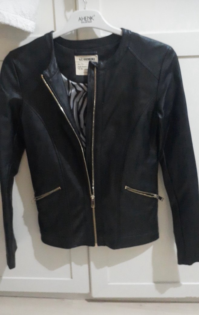 Fermuarlı, notched lapel yaka ve strappy kollara sahip siyah deri, fitted kesim kadın biker ceket. Midi boy ve Paris tarzı, ofise uygun şık görünüm sunar.