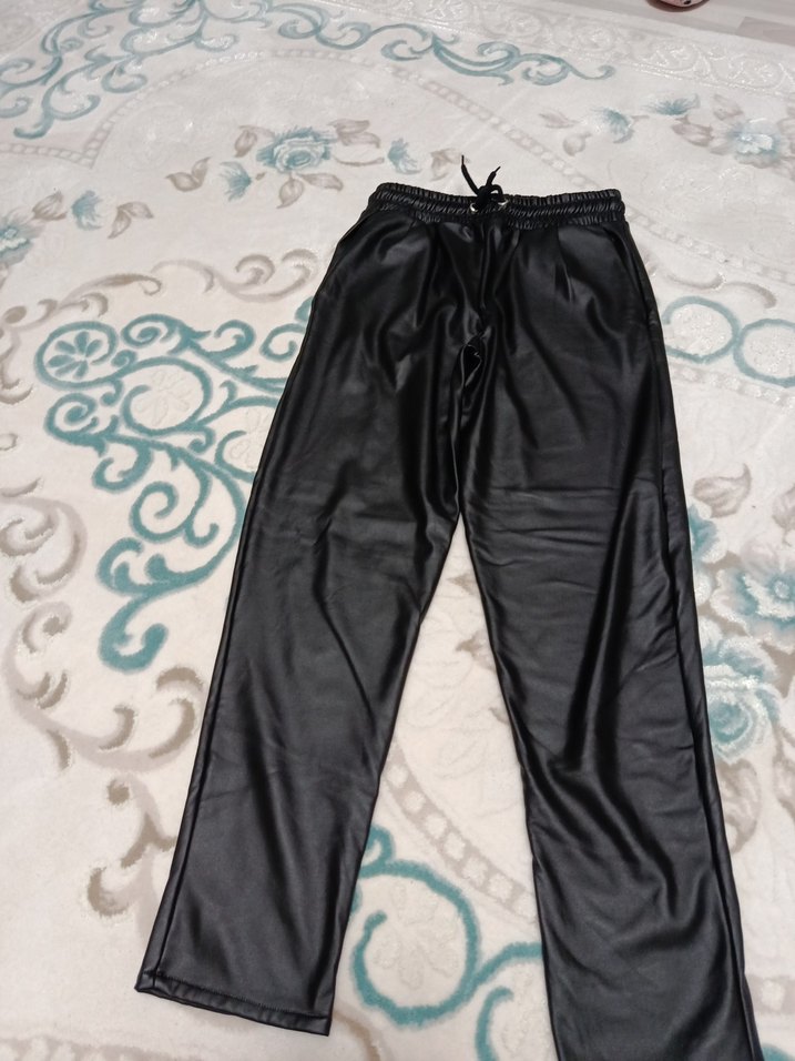 Siyah renkte, bol kesim ve uzun boy kadın deri pantolon. Ayarlanabilir kemerli bel kısmı ile rahat kullanım sağlar, günlük ve sokak stiline uygundur.