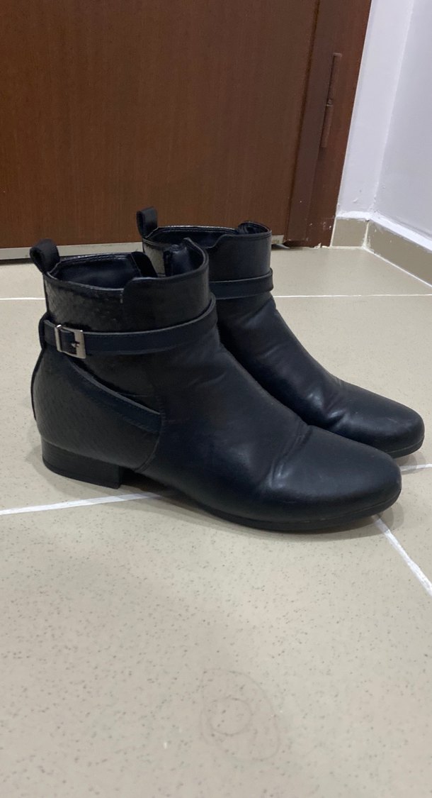 Siyah deri, tokalı ve blok topuklu kadın botu. Bir sorunu yoktur. 40 numara