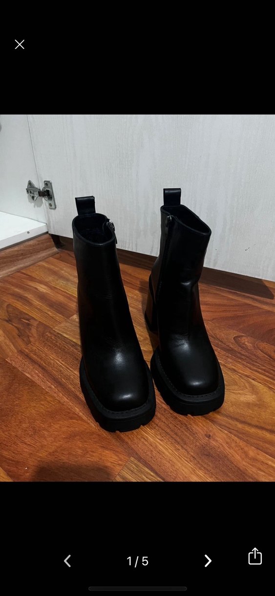 Siyah deri, blok topuklu kadın botları. Gotik tarzda, desen içermeyen ve günlük kullanıma uygun tasarım.