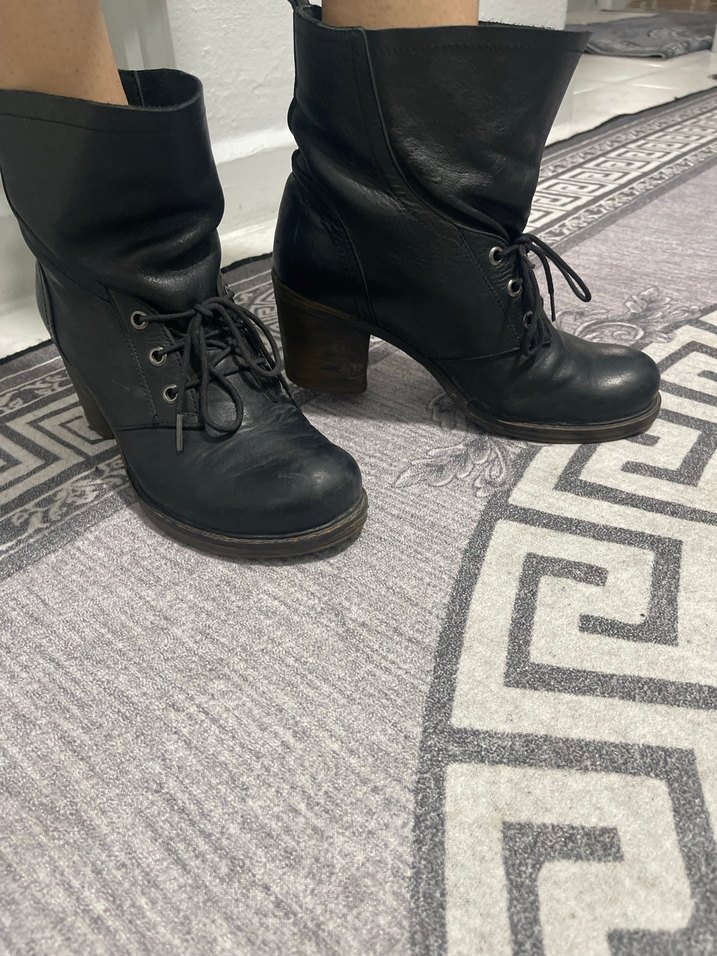 Siyah deri kadın bot, kalın topuklu Rahat tarzıyla günlük kullanıma uygun. Sorunsuz elle marka 37 yazıyor ama 38 e tam olur geniş kalıp