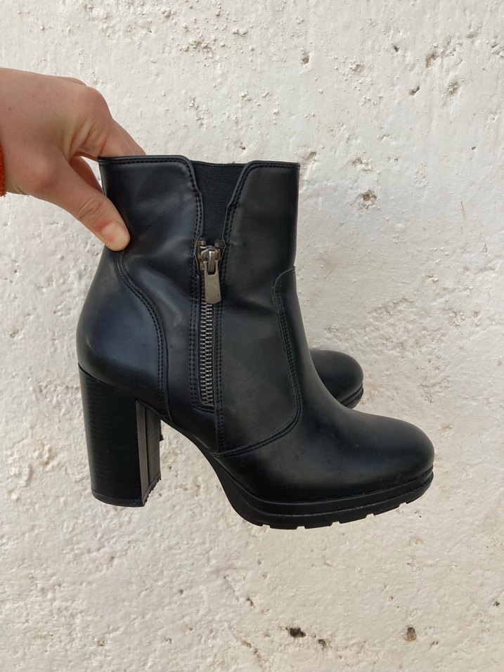 Tokalı, yan fermuarlı siyah deri kadın bot, kalın topuklu ve desen içermeyen tasarıma sahip. Trendy ve günlük kullanıma uygun.Sayfamda 37 numarası da mevcut