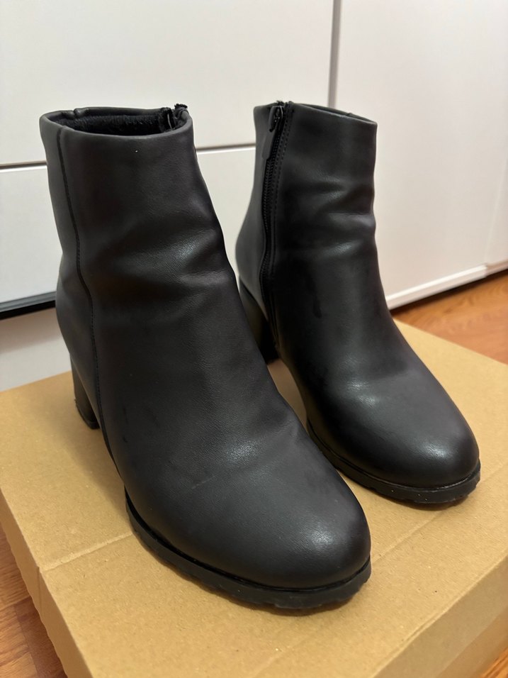 Siyah deri, blok topuklu kadın botları. Minimalist goth tarzında, günlük kullanıma uygun, şık ve rahat.