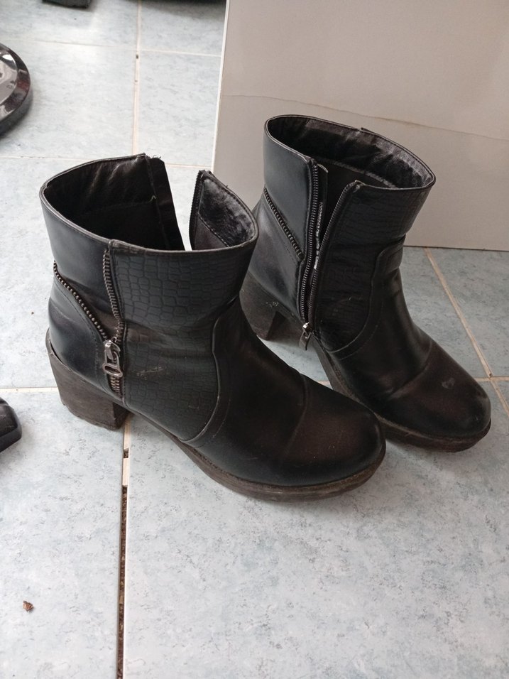 siyah Deri Kadın Bot, fermuar detaylı Topuklu
