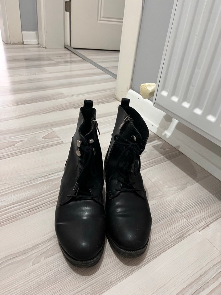 Kalın topuklu, tokalı siyah deri kadın botları. Gotik ve sokak stilini yansıtan rock punk havasında, günlük kullanım için uygun.
