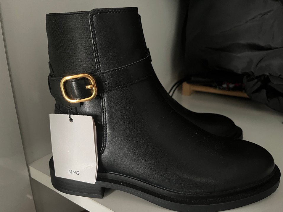 Etiketi üzerinde kullanılmamış Siyah deri kadın bot, kalın topuklu ve tokalı detaylı. Minimalist tarzda, MNG markalı, günlük kullanım için uygun.