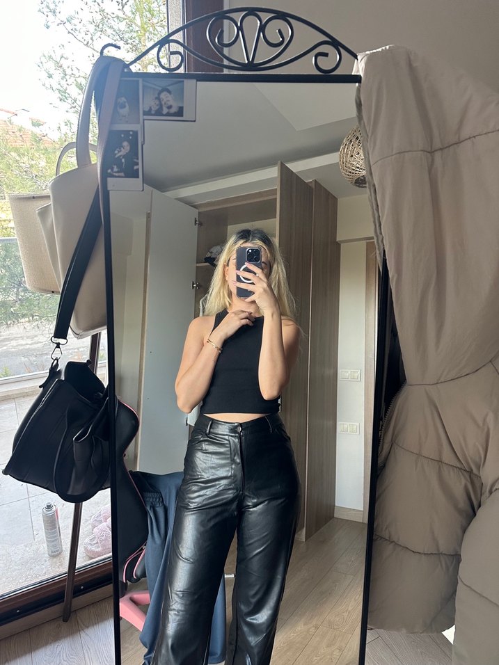 Siyah deri kadın boyfriend pantolon, midi boy ve dar kesim. Sokak modasına uygun, günlük kullanıma rahat ve şık bir seçenek.