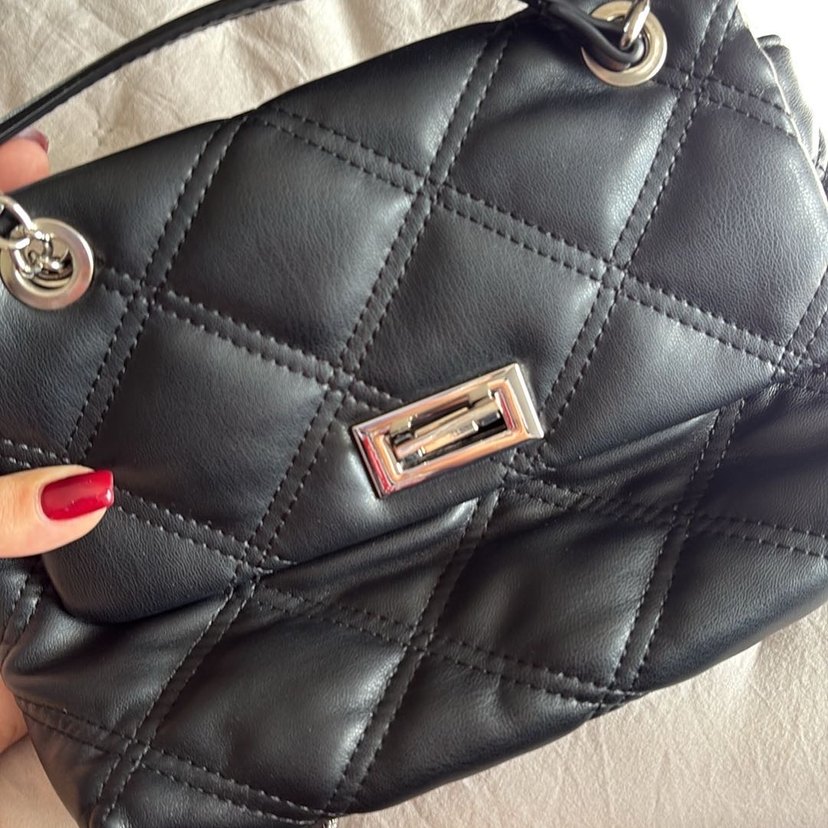Siyah deri kadın çanta, modern klasik tasarım, kapitone dikişli ve gümüş tokalı, günlük kullanım için uygundur.