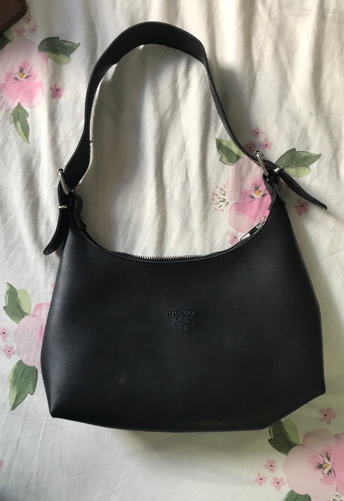 Siyah deri Prada kadın çanta, tokalı askıya sahip. Minimalist ve gotik tarzda, baskılı dokusu ile günlük şıklık için uygundur. Orijinal değildir