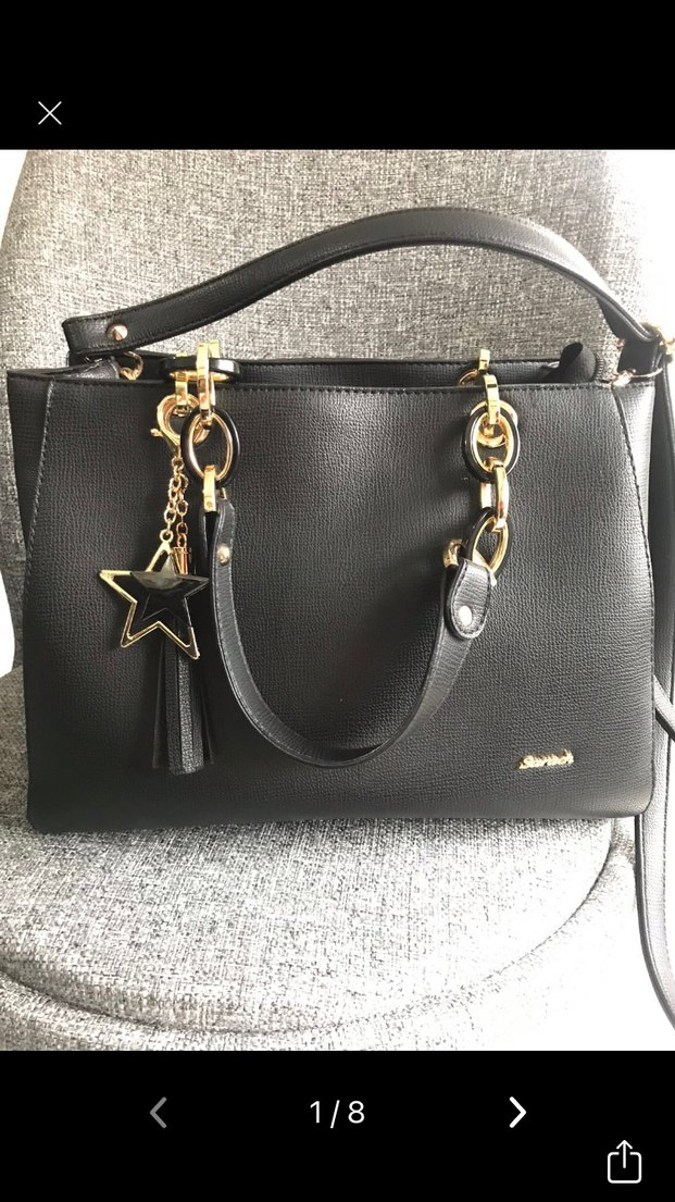 Parlak siyah deri kadın çanta, püskül ve altın detaylarla. Baskılı yıldız figürü klasik zarafet ve gotik stili birleştirir. Günlük kullanım için uygun.