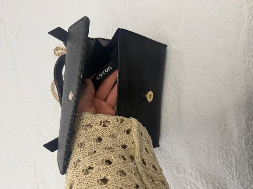 Siyah deri kadın çanta, çıtçıt ağızlı kapanışı ile günlük kullanıma uygun, zincir askılı, bohem Paris tarzını yansıtıyor.