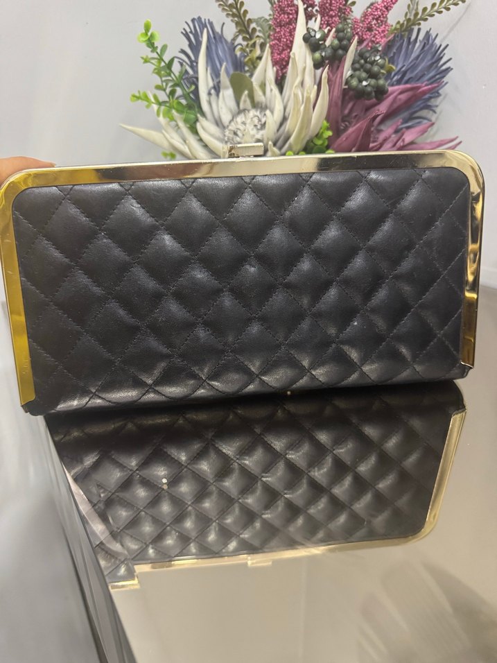 Siyah deri, kapitone desenli, altın detaylı tokalı modern klasik tarzda kadın çanta, günlük kullanıma uygun.
