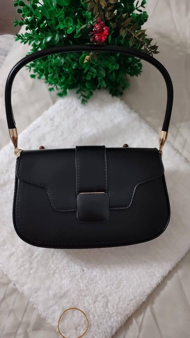 Siyah deri kadın çanta, tokalı kapama ve minimalist tasarıma sahip, günlük kullanıma uygun modern klasik stil.