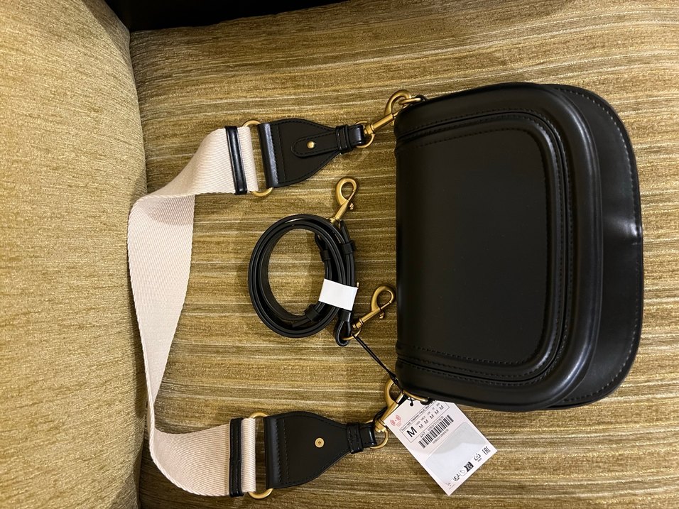 Siyah deri, tokalı ve baskılı detaylara sahip kadın çanta. Ayarlanabilir kayışıyla sokak modasına uyum sağlar.