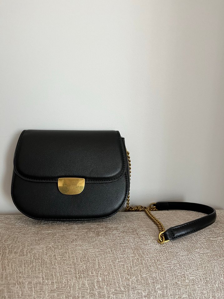 Siyah deri kadın çanta, tokalı kapama ve zincir askılı.Sarı renkli yerde çok az bir çizik var.Çok belli olmuyor.