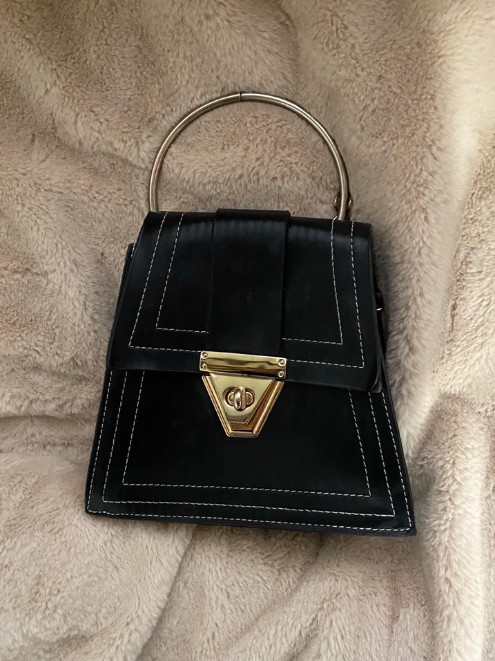 siyah deri kadın çantası, altın renkli sapı ve baskılı deseniyle modern klasik ve Paris tarzını yansıtıyor. Günlük kullanım için uygundur.
