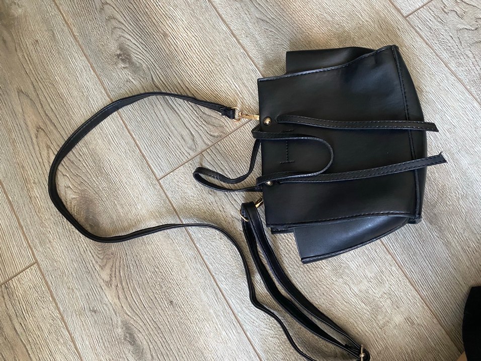 Siyah deri kadının çantası, tokalı detaylara ve minimalist tasarıma sahiptir. Günlük kullanıma uygundur, çağdaş ve moda tutkunlarına hitap eder.