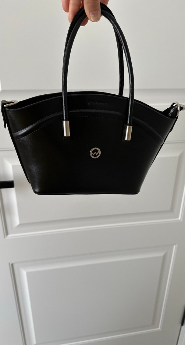 Siyah deri, tokalı askılı, minimalist tasarımlı ve modern klasik tarza sahip kadın çantası.