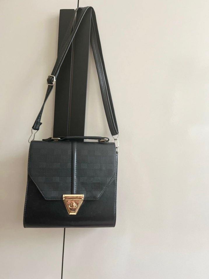 Kareli desene sahip siyah deri kadın çantası, tokalı kapama detaylıdır. Modern klasik tarzda, iş hayatına uygun, günlük kullanıma uygundur.