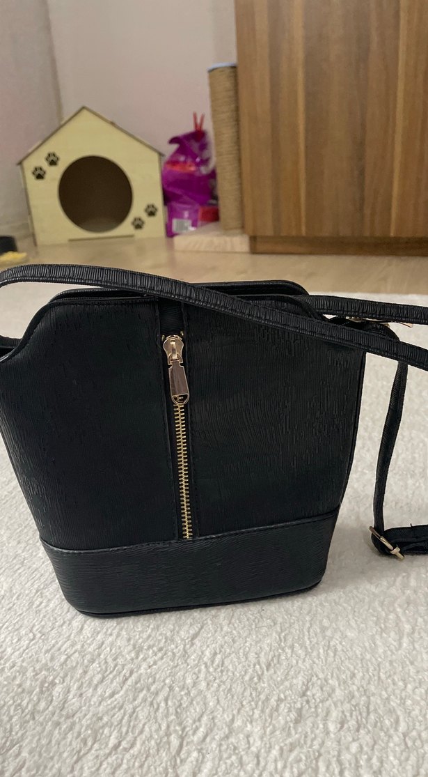 Siyah deri kadın çanta, ön kısmında fermuarlı, sade ve çağdaş tasarıma sahip, günlük kullanım için uygun.